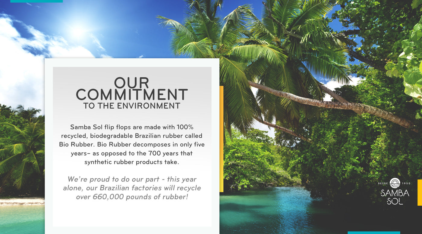 Our flip flops are made with 100% recycled, BIODEGRADABLE Brazilian rubber. This material, called Bio Rubber, is biodegradable within roughly five years as opposed to the 700 years that synthetic rubber products take. We attack the environmental issue from start to finish, by crafting our sandals out of recycled waste, and ensuring that, when discarded, they return to the earth from which they came. This year, our Brazilian factories will recycle over 660,000 pounds of rubber!